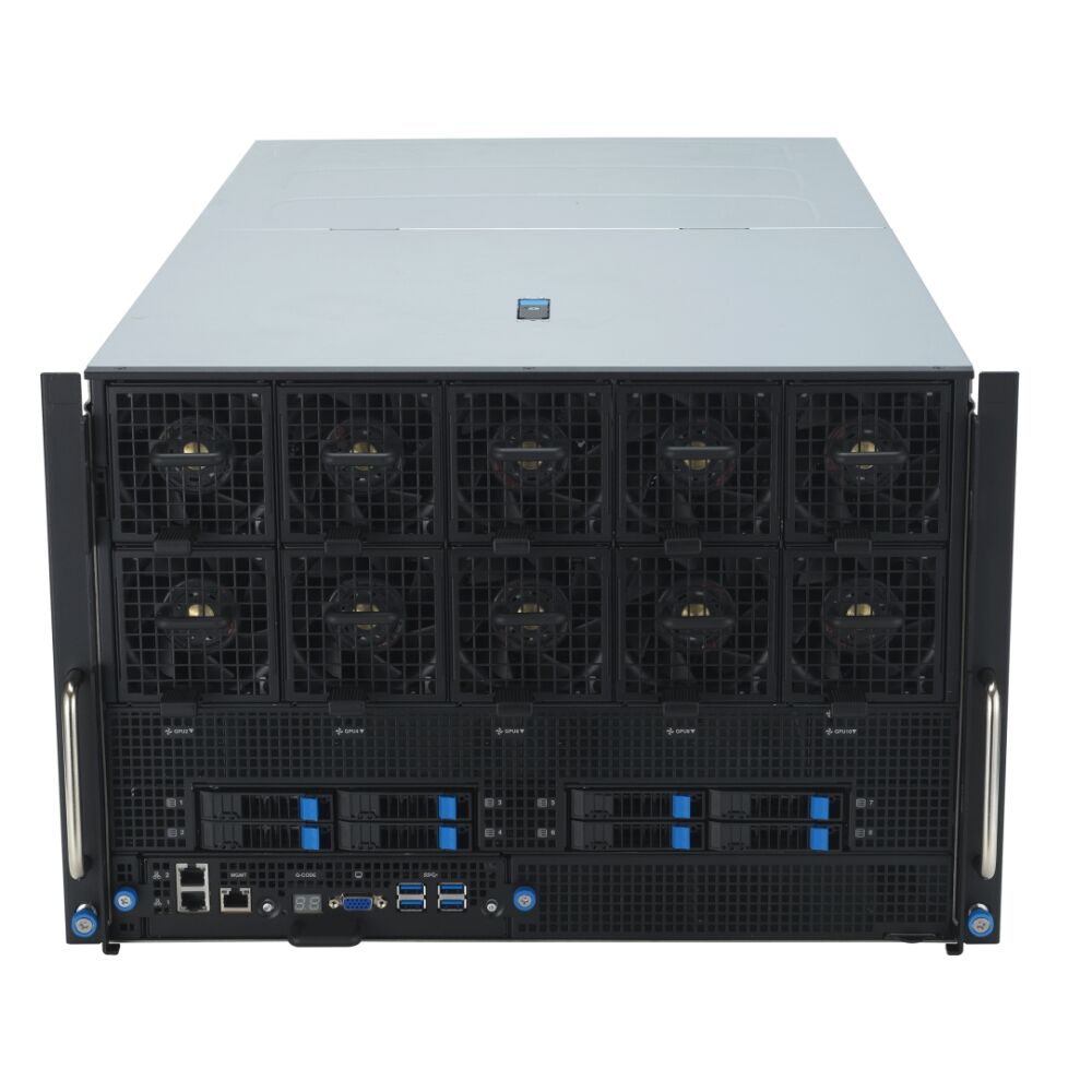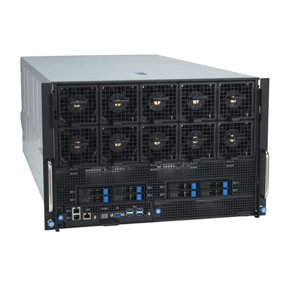Сервер 7U NVIDIA HGX H100 із вісімома GPU та двома процесорами Intel Xeon Scalable 4-го покоління, розроблений для масштабних завдань штучного інтелекту (ШІ) та високопродуктивних обчислень (HPC), з 10+1 або 12+1 слотами PCIe , 32 слотами DIMM, 10 накопичувачами NVMe, двома 10-Гбіт мережевими адаптерами LAN і додатковим роз’ємом OCP 3.0. Мережеві інтерфейси та пристрої зберігання розташовані поблизу GPU; використовується співвідношення GPU до мережевого інтерфейсу (NIC) до 1:1, а дизайн GPU Direct Storage дозволяє знизити затримки читання/запису. ESC N8-E11 є оптимальним рішенням для розвитку технологій ШІ у корпоративних застосуваннях.